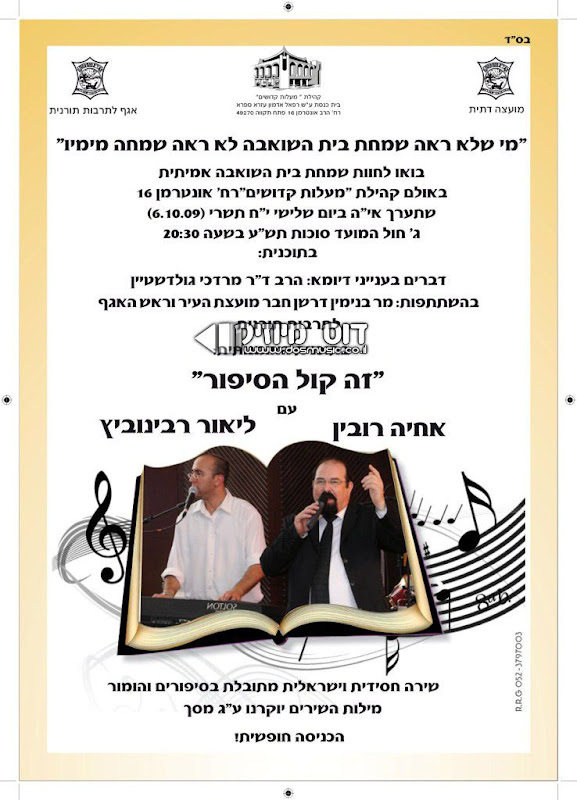 יום שלישי ג' חול המועד סוכות בשעה 20:30 באולם קהילת 'מעלות קדושים' בפתח תקווה. זה קול הסיפור - עם הזמר 'אחיה רובין' וליאור רבינוביץ.