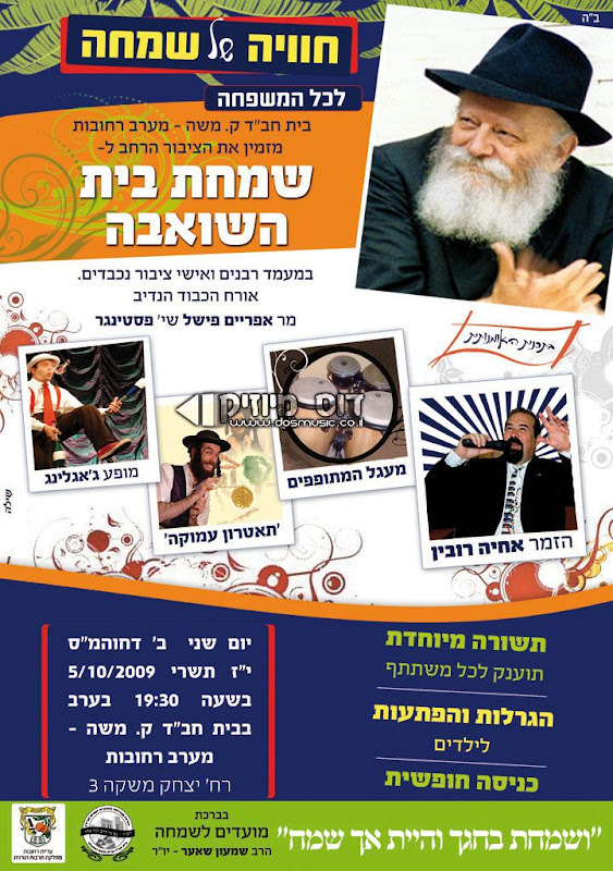 יום שני ב' בחול המועד סוכות בשעה 19:30 בבית חב"ד קרית משה ברחובות יופיעו הזמר 'אחיה רובין' מעגל מתופפים, תאטרון עמוקה, ומופע ג'אגלינג.