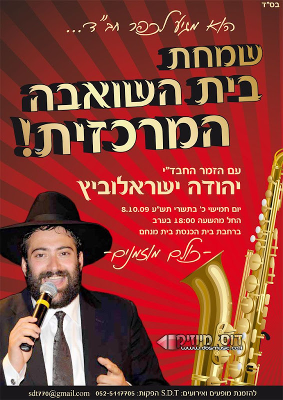 מאת: דוד ב.ד - דוס מיוזיק ביום חמישי כ' בתשרי 8.10.09 ברחבת בית הכנסת בית מנחם שבכפר חב"ד תתקיים שמחת בית השואבה המרכזית עם הזמ...
